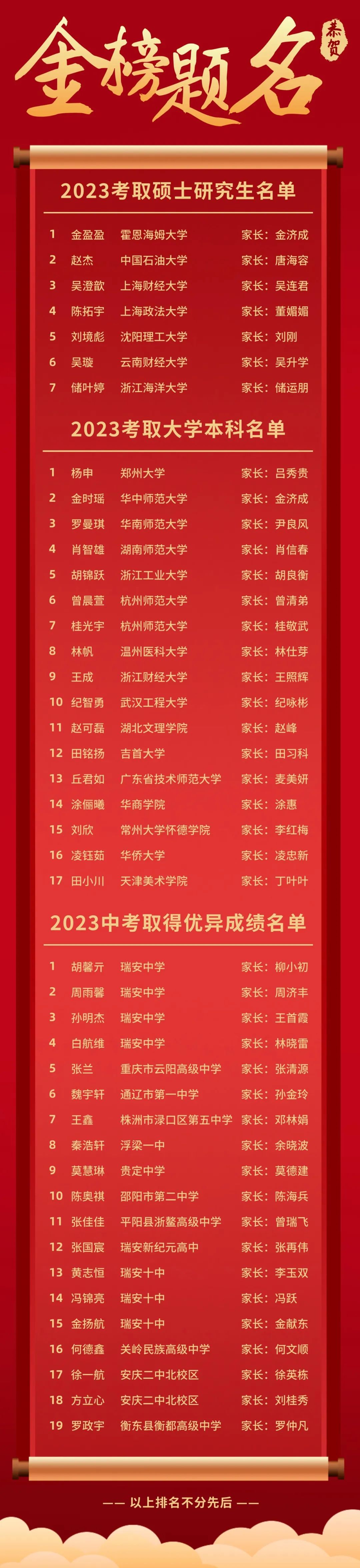 第一,期望同學們能夠踏上更高的層次,在前行的道路上勇往直前,無懼挫折,培育自我同時回報父母和親友,成為對社會有所貢獻的人;第二,希望同學們能夠將這次的升學作為新的起點,無論是研究生、本科生還是高中生,都應心態歸零再出發,不斷奔向人生新目標;第三,期盼同學們能夠全力以赴,堅韌不拔,珍惜歲月,成為時代的同行者。